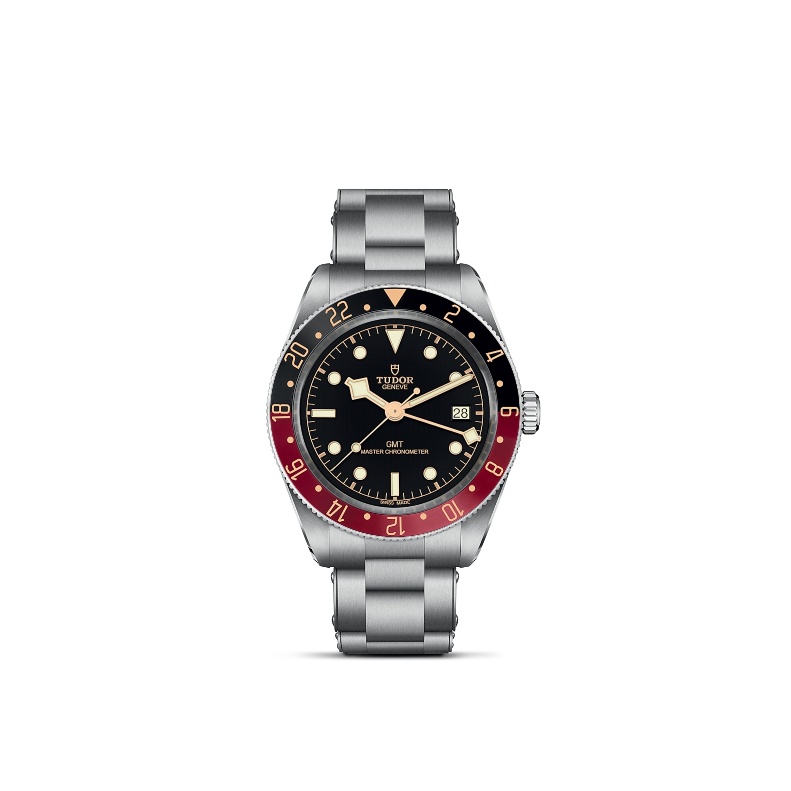 Bracciale rivettato a 3 maglie in acciaio, finitura lucida e satinata, con chiusura TUDOR “T‑fit”, Cassa in acciaio, 39 mm, finitura lucida e satinata, Nero, bombato, con indici delle ore dorati applicati, Corona di carica a vite in acciaio con la rosa TUDOR in rilievo, Impermeabile fino a 200 m, Lunetta girevole bidirezionale in acciaio con disco graduato 24 ore in alluminio anodizzato nero e bordeaux, acciaio, Calibro di Manifattura MT5450-U, certificato dal COSC e dal METAS Movimento meccanico a carica automatica con rotore bidirezionale Funzione GMT integrata, Quadrante scuro, media, Vetro zaffiro bombato